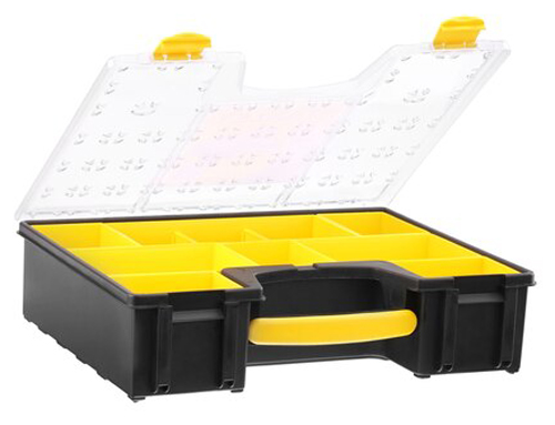 L'organiseur professionnel profond est conçu pour le rangement et le transport d'outils et d'accessoires. Il dispose de huit compartiments profonds, permettant une organisation efficace des éléments de petite taille. Le couvercle en polycarbonate, matériau résistant aux chocs, protège le contenu et empêche le mélange des pièces pendant le transport.