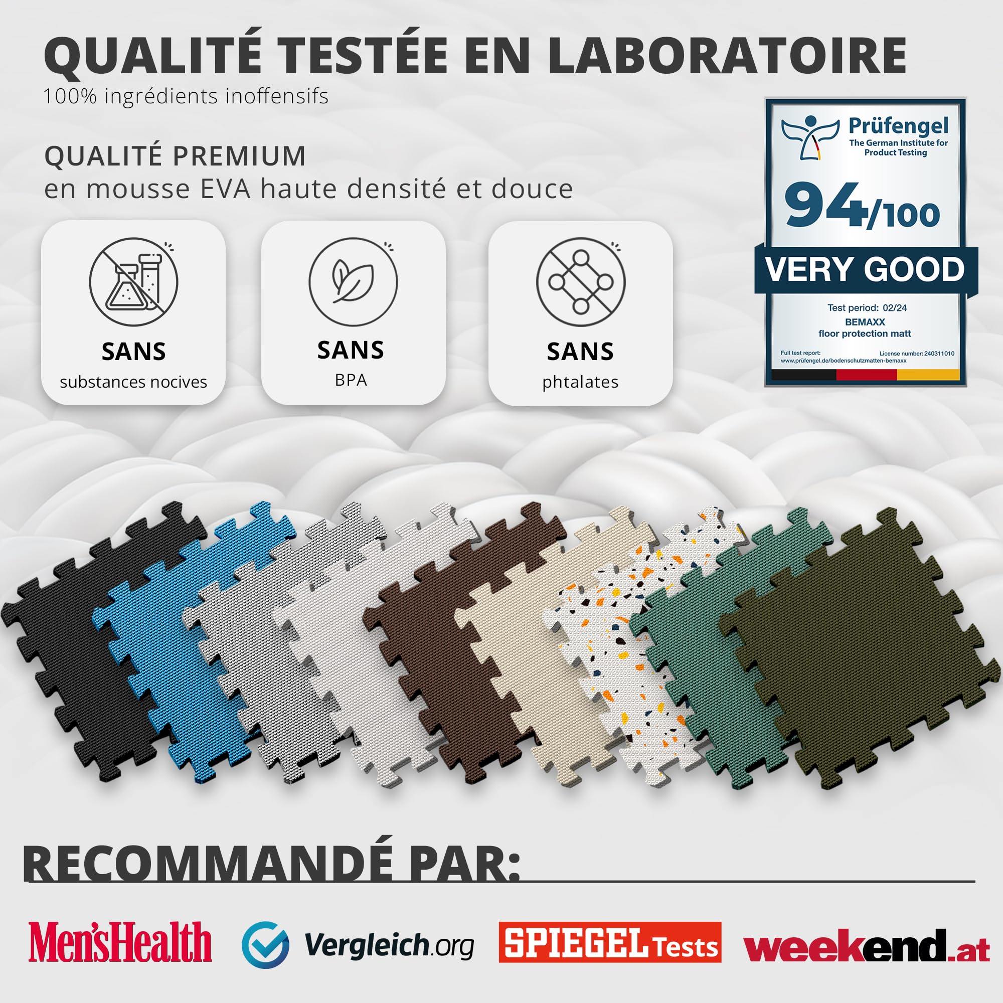 💪 𝗤𝗨𝗔𝗟𝗜𝗧É 𝗣𝗥𝗘𝗠𝗜𝗨𝗠 𝗧𝗘𝗦𝗧É𝗘 𝗘𝗡 𝗟𝗔𝗕𝗢𝗥𝗔𝗧𝗢𝗜𝗥𝗘 - SANS SUBSTANCES NOCIVES & SANS BPA – Notre promesse bemaxx - Votre santé est importante pour nous : Tous nos tapis ont été testés en laboratoire et sont exempts de substances toxiques et nocives pour la santé. Ils sont donc parfaitement adaptés à une utilisation à la maison, par exemple dans les salles de jeux ou pour le fitness à domicile, etc.