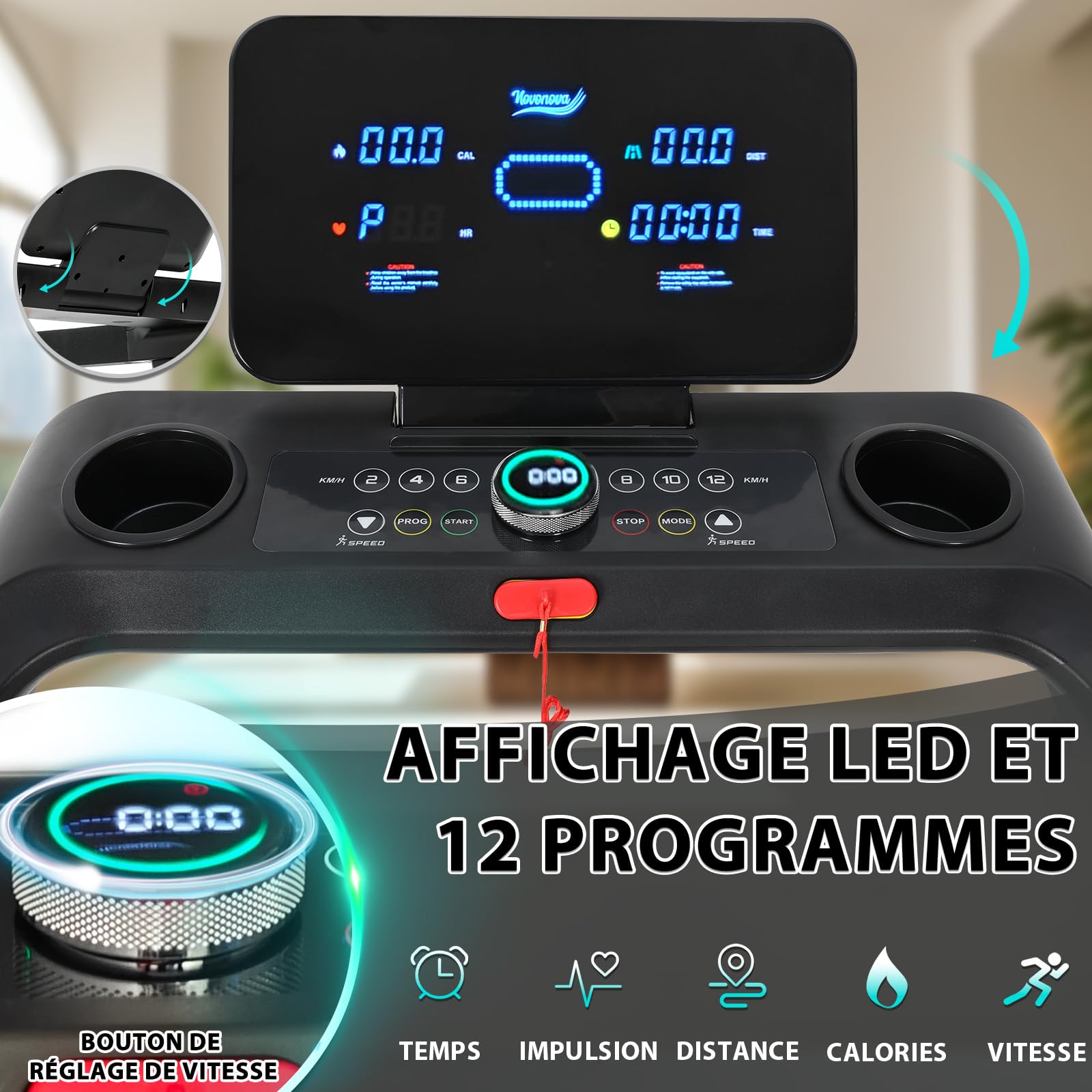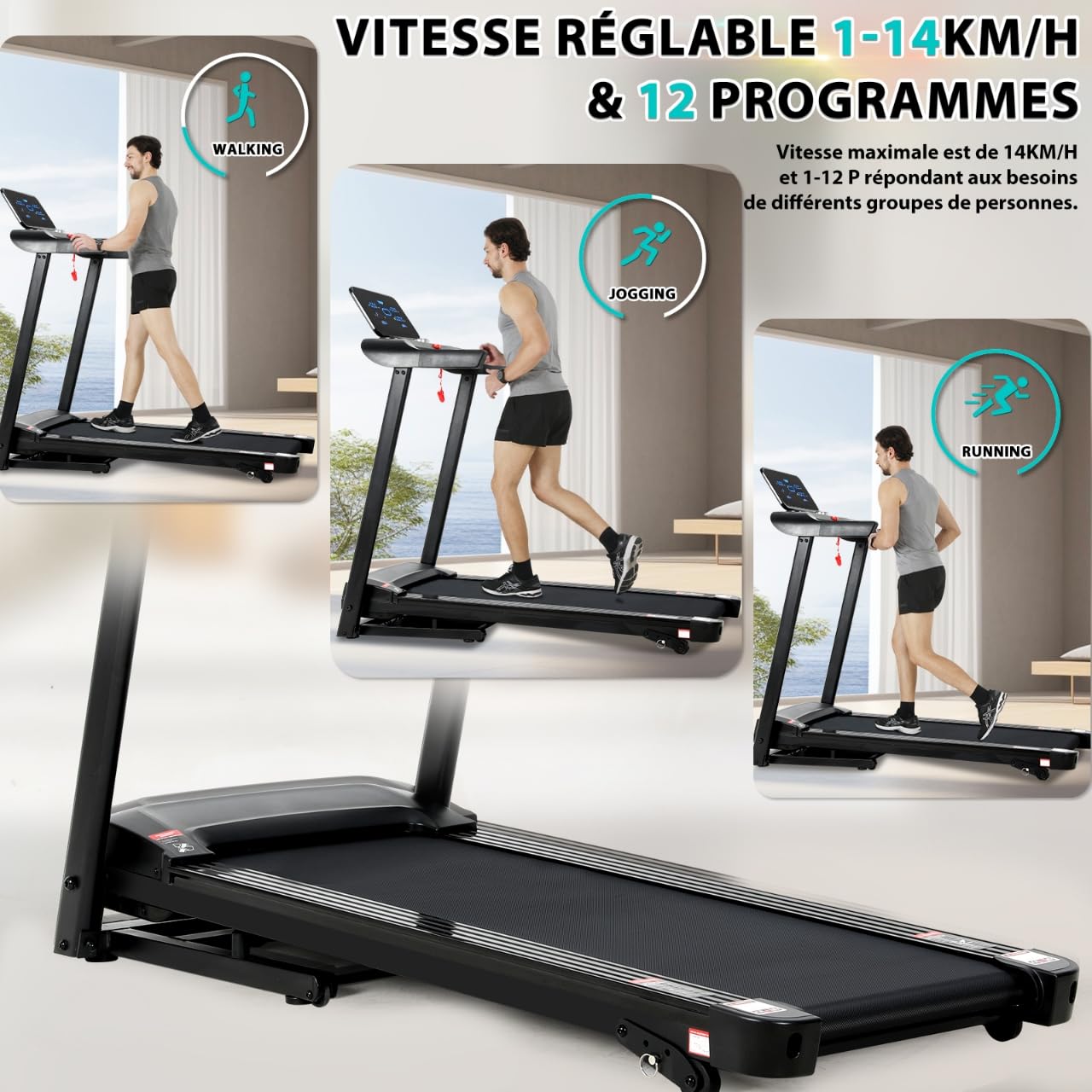 Écran LED de haute qualité affiche le temps/distance/vitesse/calories. Des capteurs de fréquence cardiaque sont situés sur les accoudoirs pour surveiller votre fréquence cardiaque pendant l'exercice. 12 programmes d'exercices prédéfinis et vitesse réglable 14KM/H, vous pouvez facilement ajuster le mode de course et l'intensité en fonction de votre condition physique et de vos besoins de fitness, réaliser la marche/jogging/course et d'autres modes de course. Capacité de charge ultra 150KG.