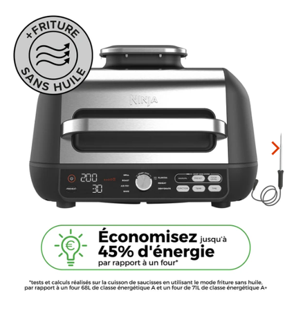 Le Ninja Foodi MAX PRO AG651EU est un appareil de cuisson multifonctionnel qui combine grill d’intérieur, plancha et friteuse à air chaud. Il est doté de 7 fonctions de cuisson : Grill, Plancha, Air Fry, Rôtir, Cuire au four, Réchauffer et Déshydrater. Grâce à ses 2 plaques interchangeables (grill et plancha), il permet de cuisiner une variété d’aliments, des steaks juteux aux légumes délicats. La sonde de cuisson numérique intégrée assure une cuisson précise en surveillant la température des aliments en temps réel. Avec une puissance de 2460 W et une capacité de 3,8 L, il est idéal pour préparer des repas pour 4 à 6 personnes. De plus, ses composants amovibles sont compatibles lave-vaisselle, facilitant le nettoyage.