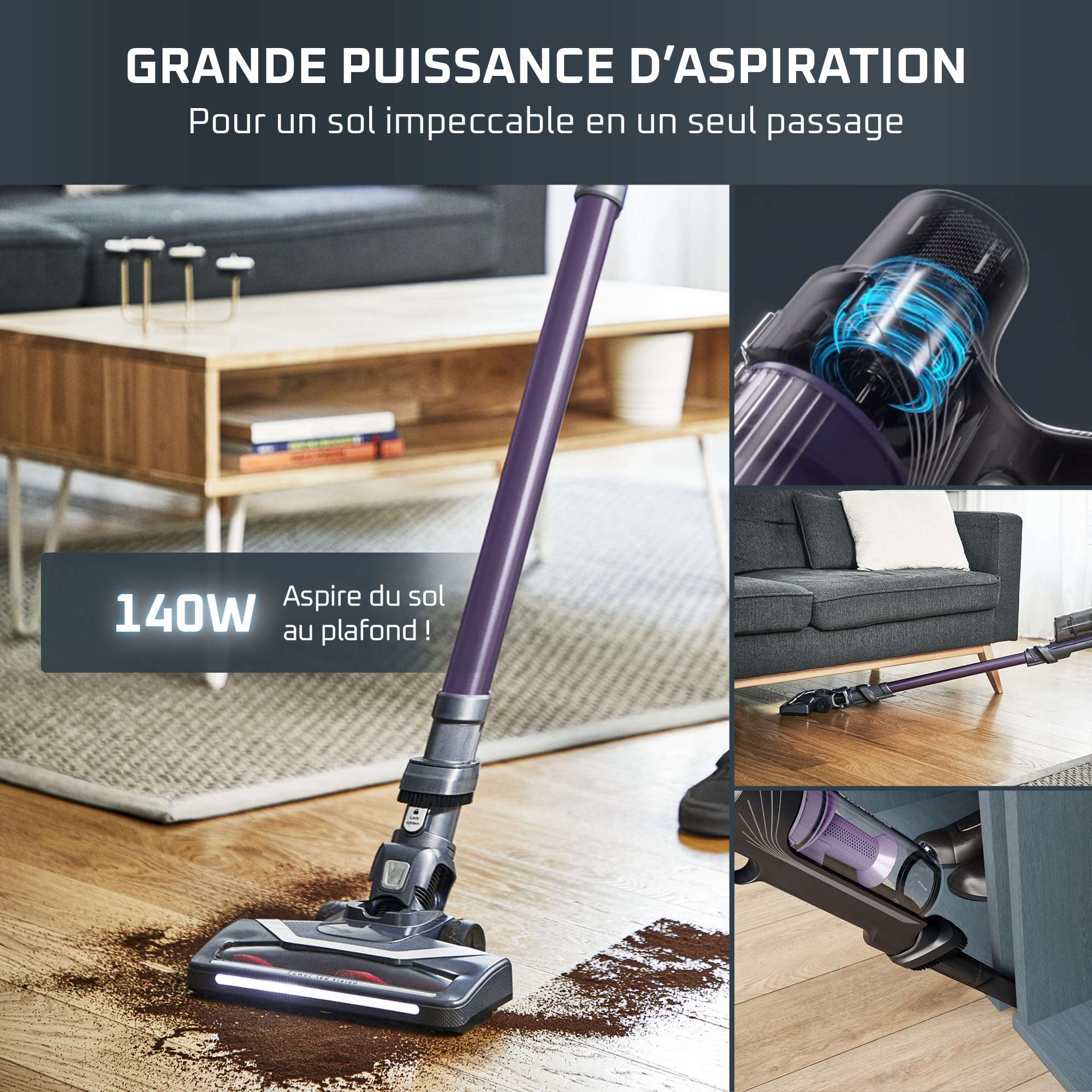 ASPIRATION PUISSANTE: aspirateur balai sans fil offrant une puissance de 140W pour nettoyer facilement votre maison en profondeur, du sol au plafond et sur toutes les surfaces