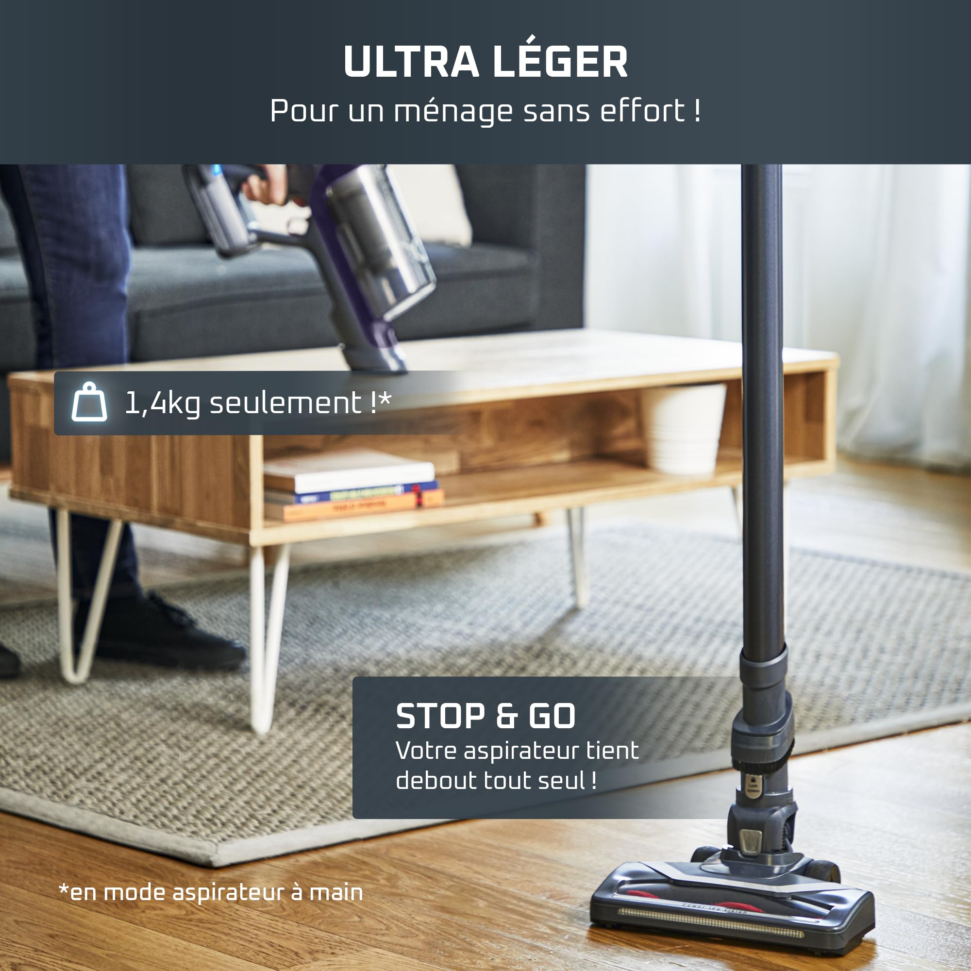 ASPIRATION SANS EFFORT: technologie optimisée dans un design fin et léger (poids de l'aspirateur à main: 1,4kg), permettant un confort d'utilisation total