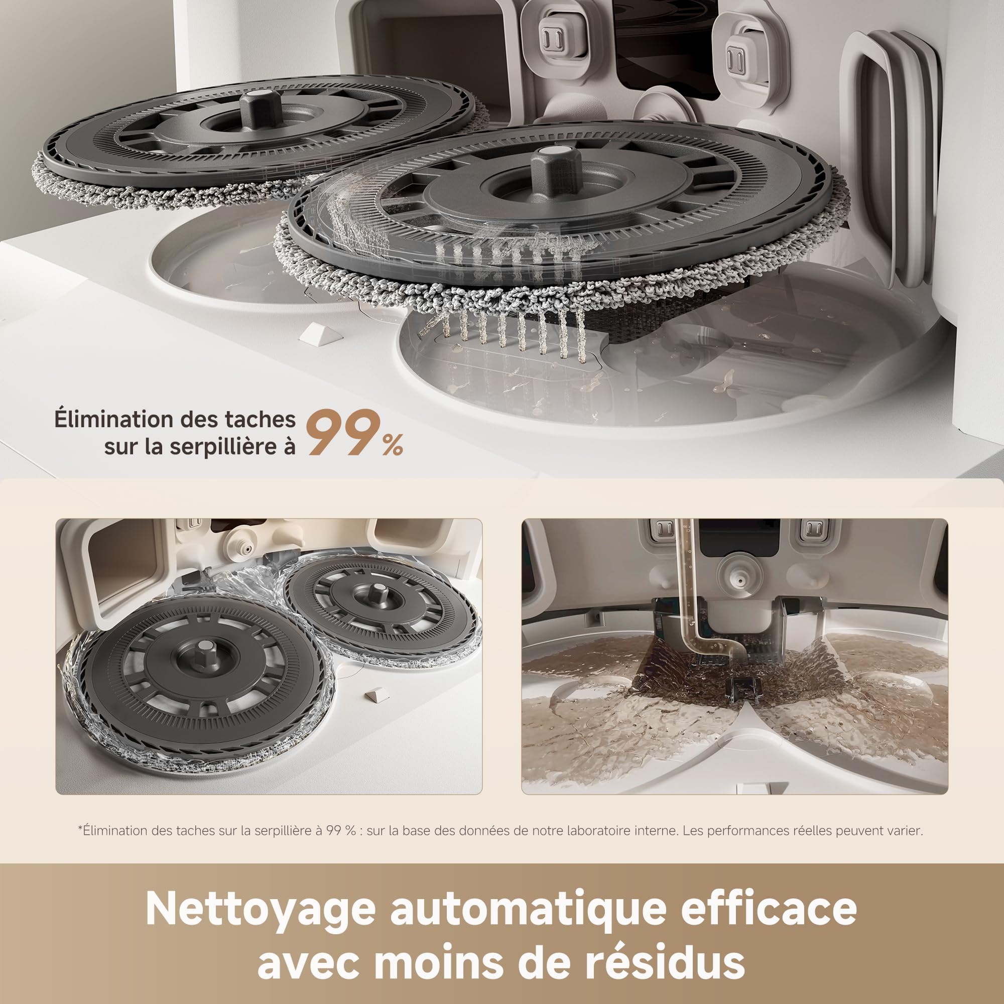 [Moins d’entretien manuel] a base à nettoyage automatique tout-en-un optimise l’expérience de nettoyage autonome : nettoyage automatique de la plaque de lavage, nettoyage automatique des serpillières, vidage automatique pendant 100 jours, séchage à l’air chaud, remplissage, vidange et recharge d’eau et de détergent