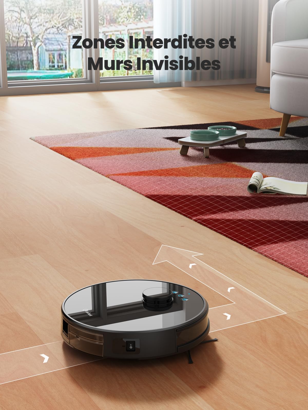 【Puissance d'Aspiration de 5500Pa】Le robots aspirateur a une puissance d'aspiration allant jusqu'à 5500 Pa et trois niveaux de puissance d'aspiration pour s'adapter à différents types de surfaces et de déchets.