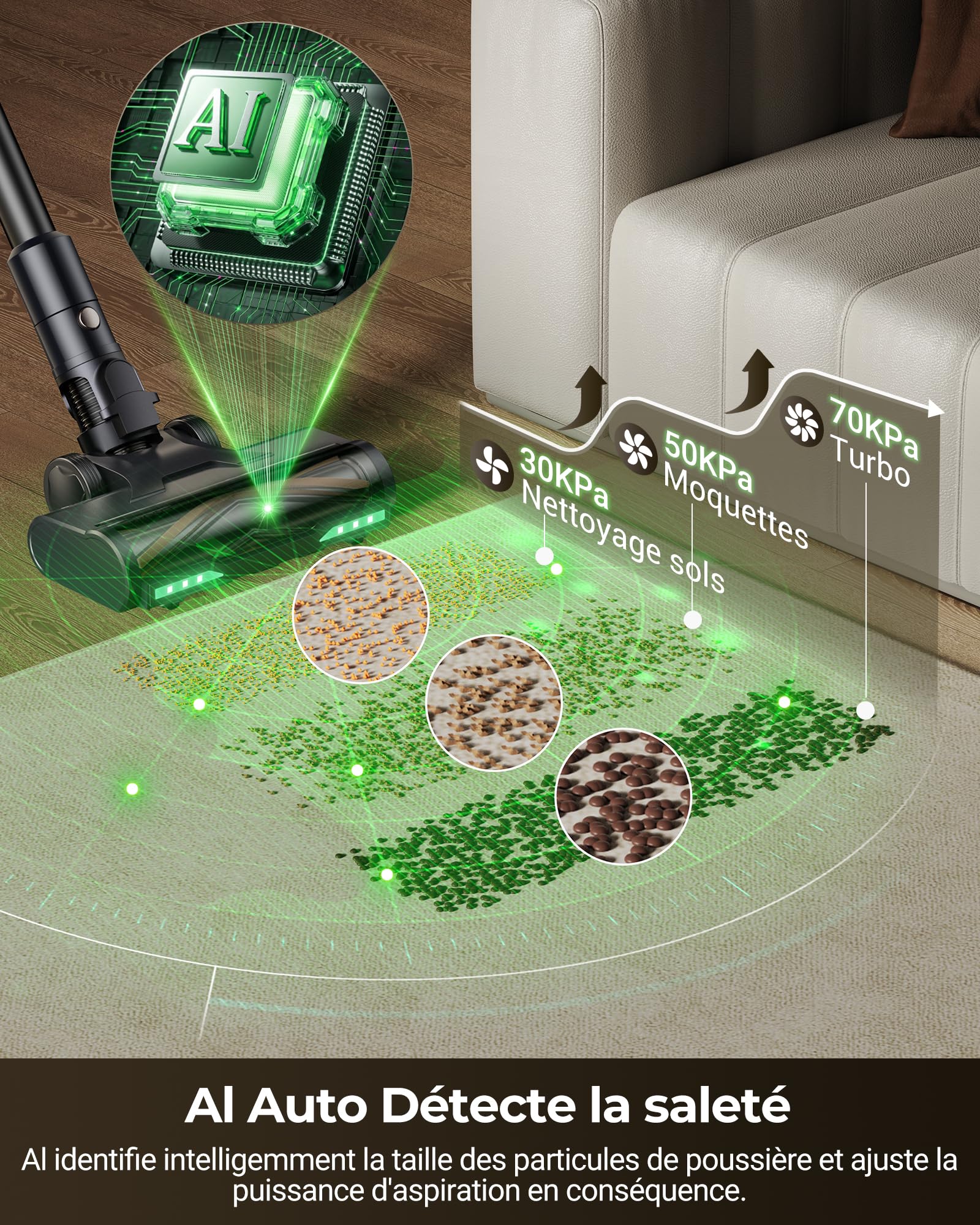 【Éclairage LED Vert (3x éclairant) et Affichage LED】350 mm³ cubes d'éclairage vert et un angle d'éclairage de 120° (3xlasurface d'une brosse normale)détectent clairement les particules aussi petites que 0,02 mm, ne laissant aucun coin intact, offrant une précision de nettoyage inégalée.Affichage LED lnteractif Dynamique Intelligent,Affichage simple et intuitif de l'état del'aspirateur,Pratique à utiliser pour les personnes âgées et les enfants
