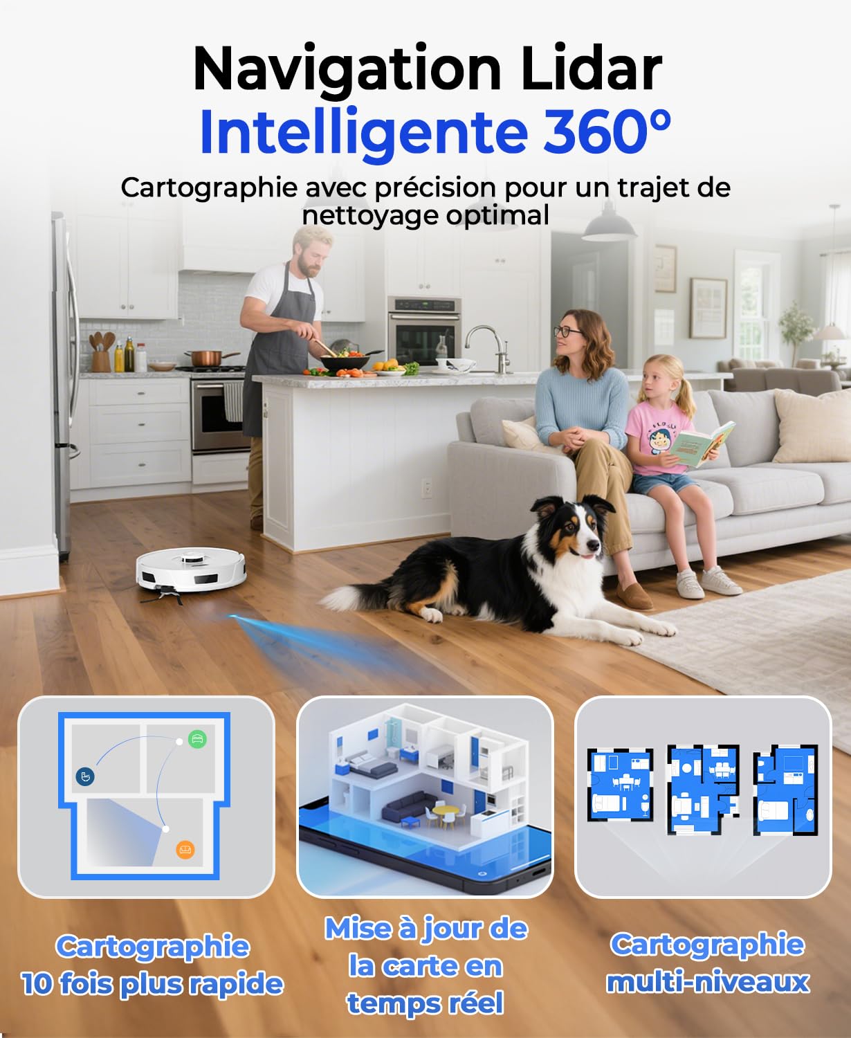 🛰️ 𝗡𝗮𝘃𝗶𝗴𝗮𝘁𝗶𝗼𝗻 𝗜𝗻𝘁𝗲𝗹𝗹𝗶𝗴𝗲𝗻𝘁𝗲 𝗟𝗶𝗗𝗔𝗥 𝟯𝟲𝟬° & 𝗖𝗮𝗿𝘁𝗼𝗴𝗿𝗮𝗽𝗵𝗶𝗲 𝗥𝗮𝗽𝗶𝗱𝗲 – Grâce à la technologie avancée de cartographie LiDAR, le robot aspirateur laveur crée des cartes détaillées de la maison et planifie des itinéraires optimaux, évitant collisions et zones déjà nettoyées. Il peut enregistrer jusqu’à 4 cartes, idéal pour les maisons à plusieurs étages. Un véritable allié intelligent qui respecte vos meubles et les petites pattes curieuses de vos animaux.