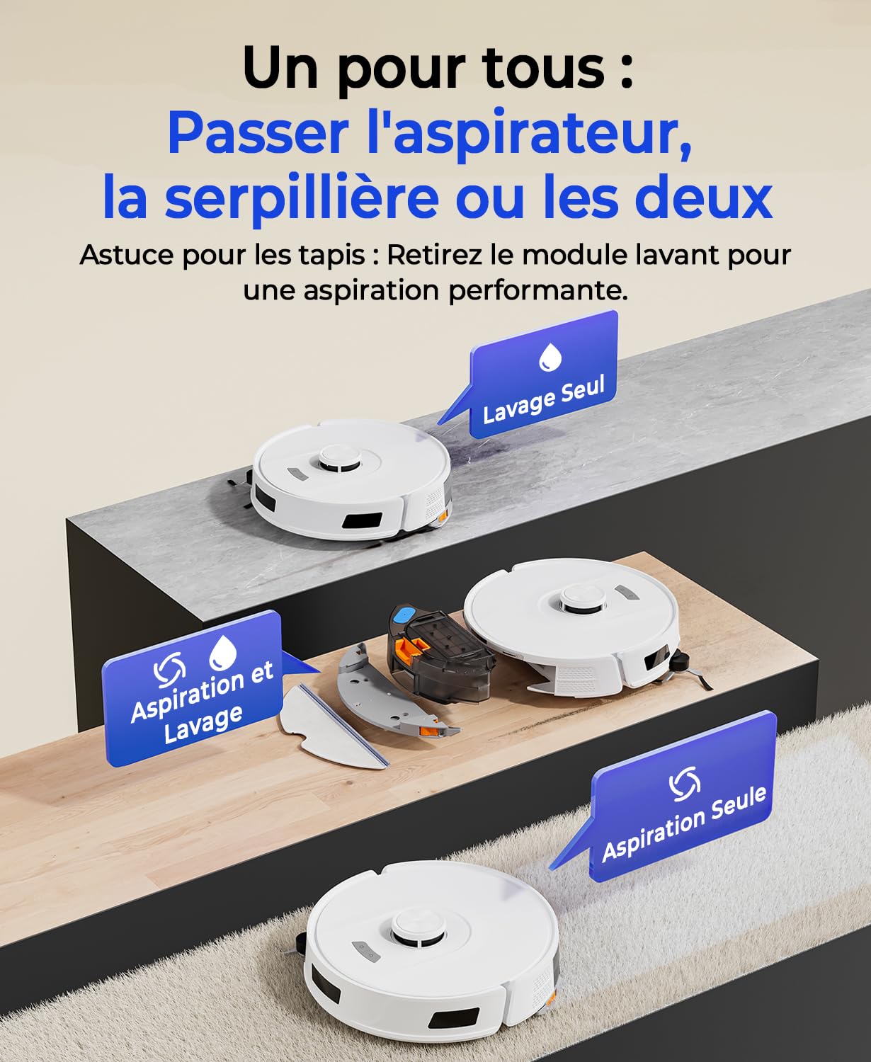 🧹 𝗡𝗲𝘁𝘁𝗼𝘆𝗮𝗴𝗲 𝗖𝗼𝗺𝗽𝗹𝗲𝘁 𝟯-𝗲𝗻-𝟭 : 𝗔𝘀𝗽𝗶𝗿𝗮𝘁𝗶𝗼𝗻, 𝗕𝗿𝗼𝘀𝘀𝗮𝗴𝗲, 𝗟𝗮𝘃𝗮𝗴𝗲 – Ce robot aspirateur intègre aspiration + brossage + lavage, éliminant le besoin de plusieurs appareils. Vous pouvez choisir le mode approprié : aspiration seule avec grand bac à poussière, lavage seul avec réservoir intelligent à 3 niveaux de débit d’eau pour les taches difficiles sans excès d’humidité, ou mode combiné pour un nettoyage profond et complet.