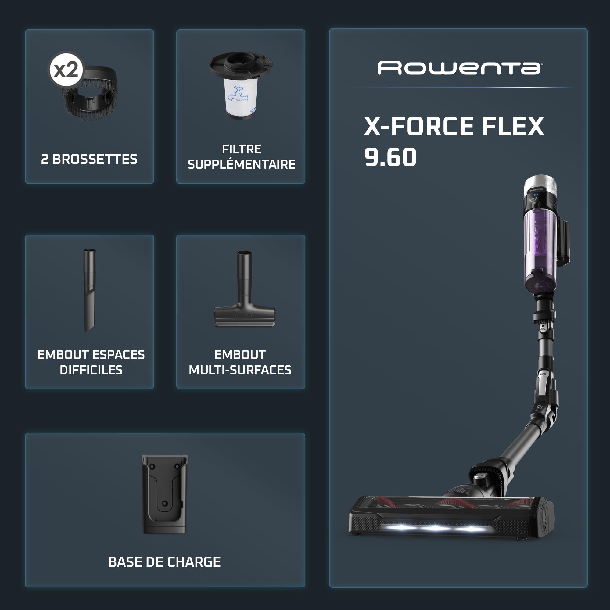 LIVRE AVEC : 2 brossettes multi-usages intégrées toujours à portée de main, suceur fente pour retirer la poussière dans les zones étroites, large suceur ameublement plat pour désincruster les surfaces plates et tissus d'ameublement, filtre supplémentaire, base de charge murale + chargeur