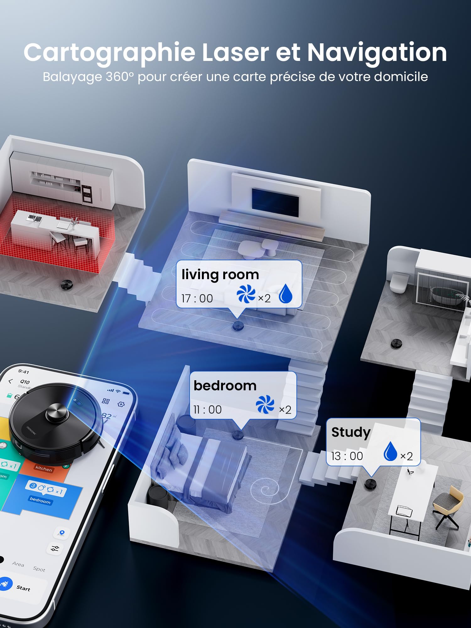 【Navigation lidar 360°】Le système LiDAR intelligent 360° cartographie votre domicile en 10 minutes (2 fois plus rapide que les autres robots), L'aspirateur robot peut détecter et éviter avec précision les obstacles tels que les meubles, les fils et les chaussures, de jour comme de nuit,Franchit sans heurts meubles bas, rideaux et espaces encombrés. Sécurité optimale pour seniors ou intérieurs chargés. Cartographie précise, trajets optimisés sans répétition ni oublis, préservant vos meubles.