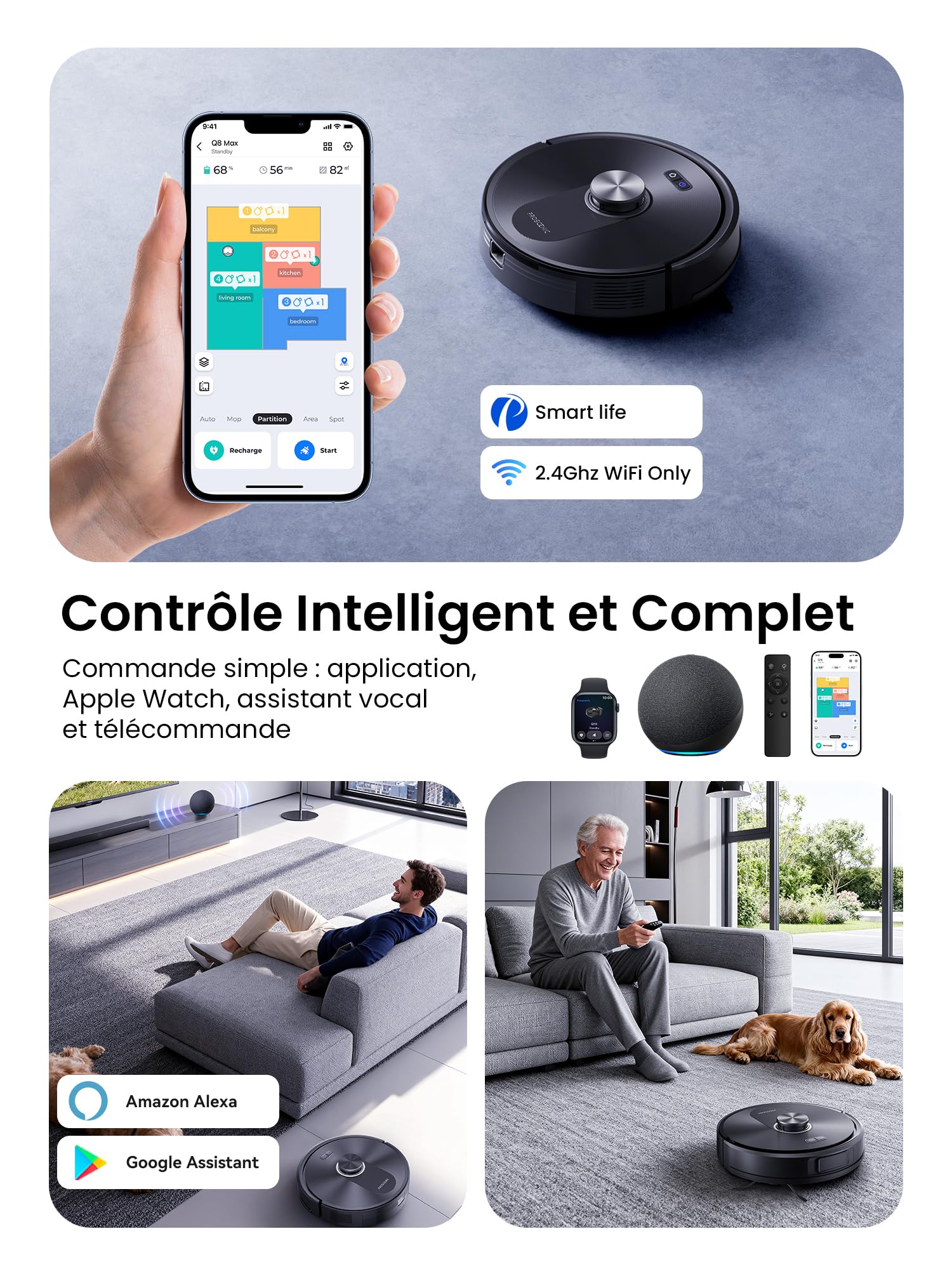 【Aspiration, Balayage & Serpillage 3 en 1】Le robot aspirateur ne se limite pas à aspirer et balayer, il offre également une fonction de serpillage, Le bac à poussière et le réservoir d'eau sont combinés en un seul module ,pour un nettoyage complet en une seule opération. Avec ses Trois niveaux d'aspiration et ses trois niveaux de réglage d'eau, Idéal pour actifs/jeunes parents : appuyez sur un boutot/Télécommande d'application et laissez la machine élim/,iner saletés sèches et taches humides,économisant du temps.